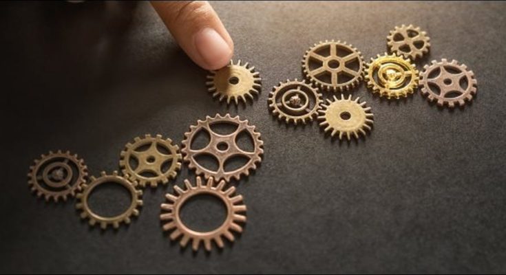 Uma mão colocando uma engrenagem mecânica em posição.