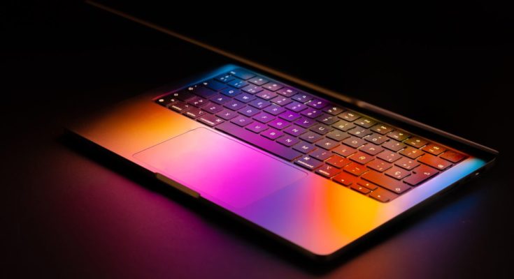 Um Apple MacBook com o laptop parcialmente levantado e a luz da tela refletida no teclado.