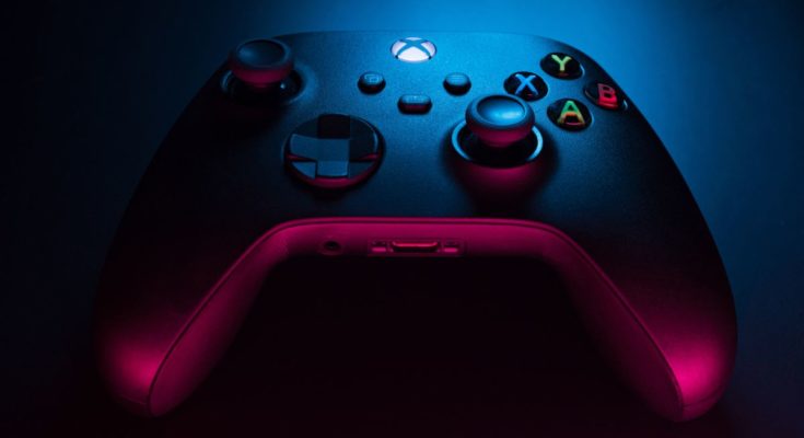 Close de um controlador Xbox Series S em negro de fumo com iluminação azul e vermelha.