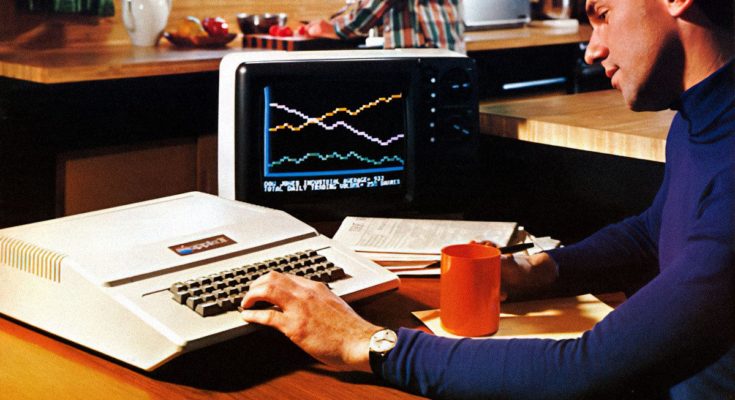 Um homem usando um Apple II em uma cozinha, década de 1970, em um anúncio antigo do Apple II.
