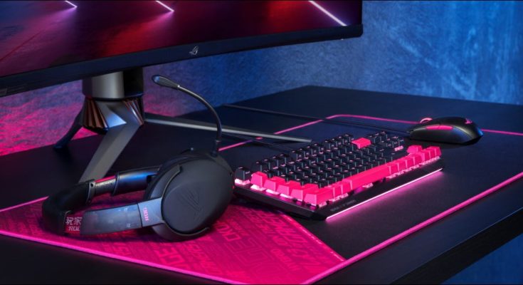 Teclado iluminado por LED de um PC para jogos, fones de ouvido, mouse e visor em uma mesa.