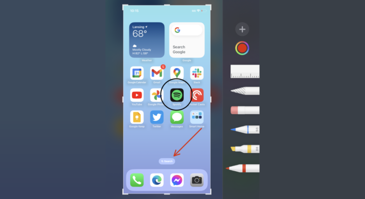 Depois de fazer uma captura de tela, você pode tocar na visualização em miniatura no canto inferior esquerdo para abrir as ferramentas de edição. Isso permite desenhar na captura de tela e há um truque secreto para fazer com que suas anotações pareçam super limpas e nítidas.