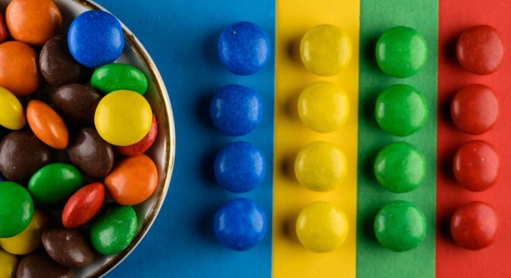 Doces coloridos classificados por cor em fileiras.