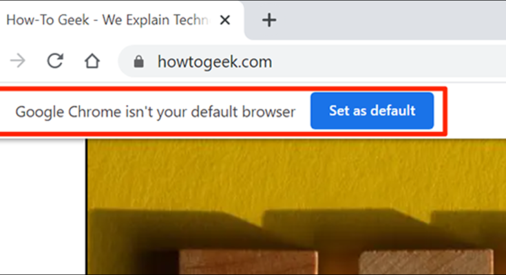 No entanto, você pode ignorar o prompt quando ele aparecer para que não distraia sua sessão atual, pelo menos. Para fazer isso, basta clicar no botão “X” no lado direito do banner do prompt do navegador padrão.