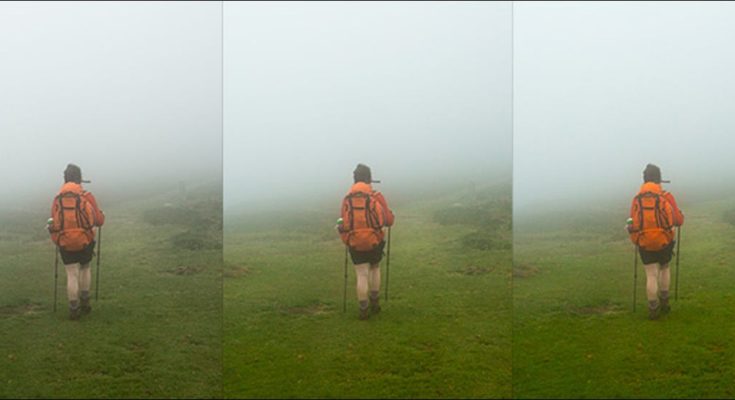 Da esquerda para a direita: Imagem original, Vibrance +50 e Saturation +50. Para esta foto, o ajuste Vibrance +50 é claramente o vencedor. Isso faz com que a grama pareça mais viva sem fazer a mochila laranja parecer ridícula.