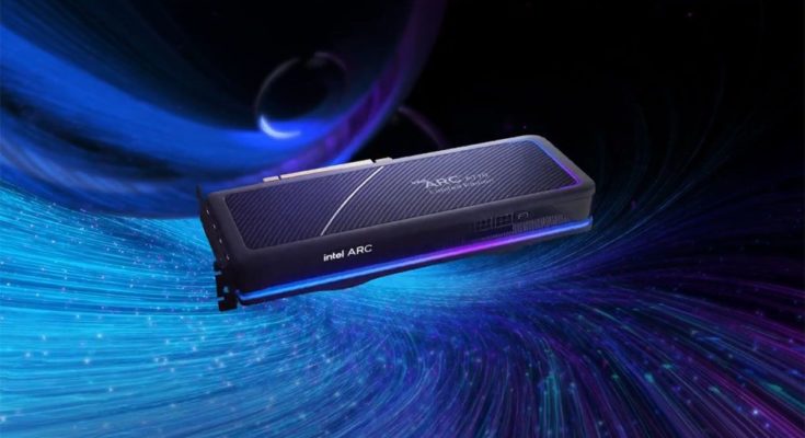 GPU Intel Arc A770 em fundo preto/azul com data de lançamento e preço