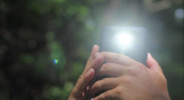 Telefone com uma lanterna acesa