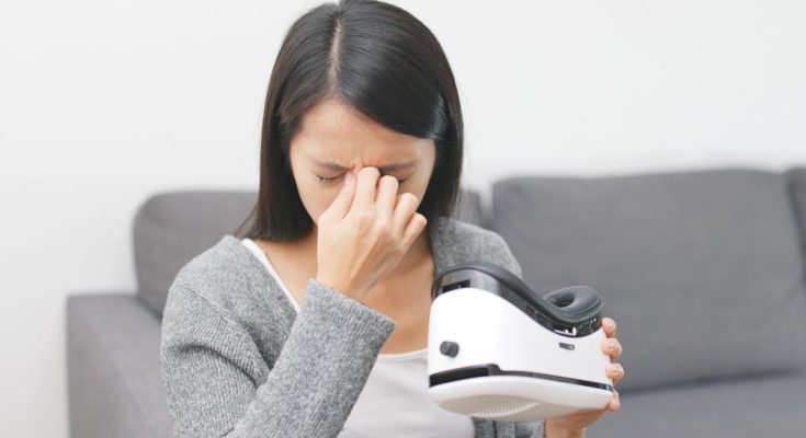 Mulher tocando a cabeça com dor após tirar um fone de ouvido de realidade virtual.