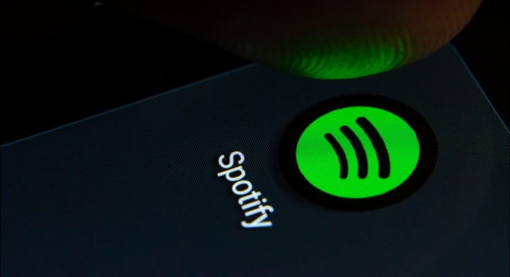 Pessoa tocando no logotipo do aplicativo Spotify em um smartphone