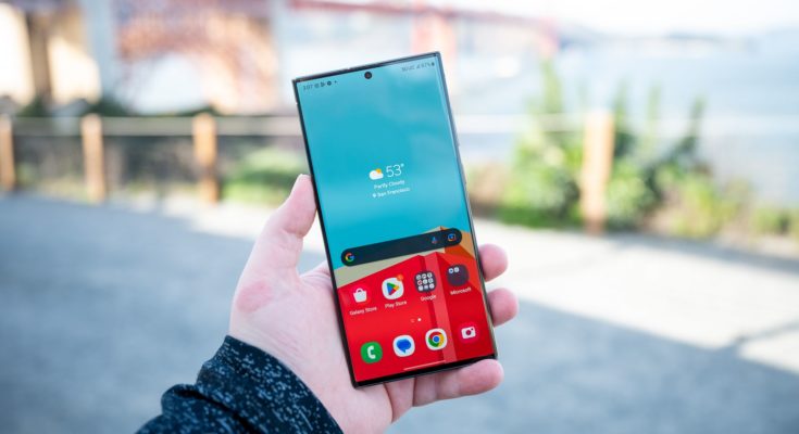 Pessoa segurando o Samsung Galaxy S23 Ultra com a tela sendo exibida