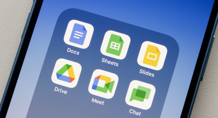 Tela do iPhone mostrando ícones do app Google Workspace.