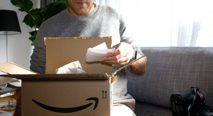 Homem abrindo um pacote da Amazon e lendo o recibo do pedido.