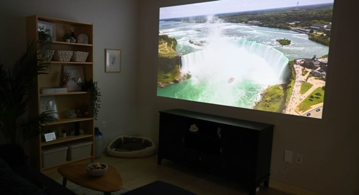 A tela de projeção portátil Vamvo é uma boa opção se você precisa de algo que possa ser montado, desmontado e movido rapidamente.
