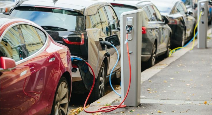 Carros elétricos estacionados em uma rua, ligados a estações de recarga.