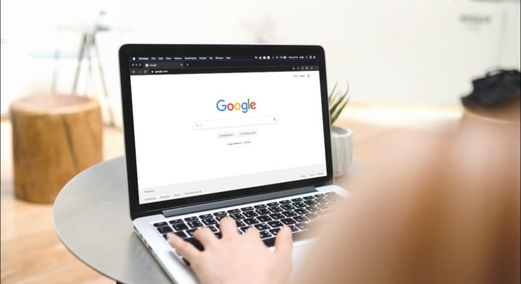 Mulher digitando em um laptop com a Pesquisa do Google aberta no navegador