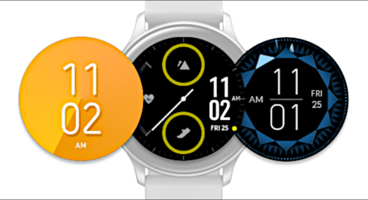 Vários mostradores de relógio ao lado de um Samsung Galaxy Watch