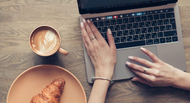 Mãos no teclado do MacBook ao lado de um café e um croissant.