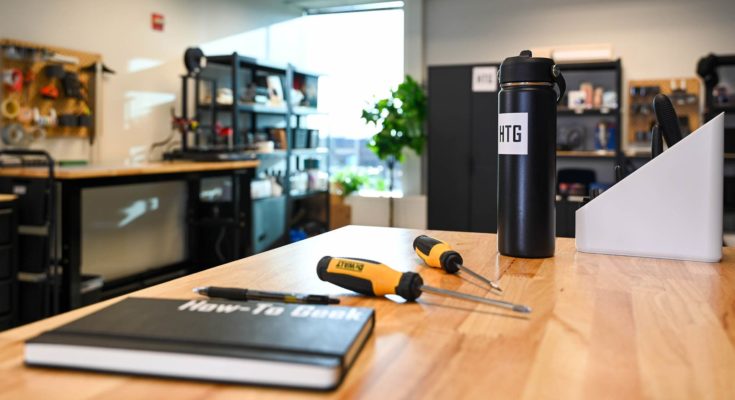 Garrafa de água HTG em bancada com chaves de fenda e notebook.