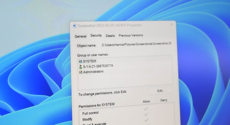 Sua conta de usuário provavelmente faz parte do grupo Usuários e do grupo Administradores se houver apenas uma conta de usuário no PC. Verifique as permissões de ambos na janela Propriedades – qualquer conta de usuário no grupo Administradores deve ter “Controle total”, mas nunca é demais ter certeza.