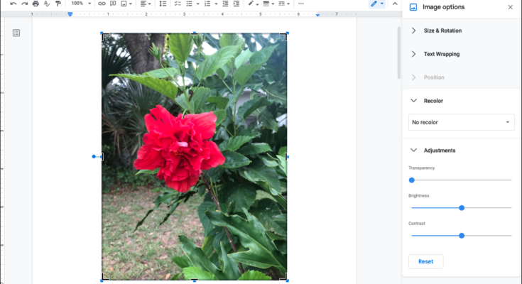 Outra maneira de editar sua imagem no Google Docs é fazer ajustes no contraste, brilho, transparência e esquema de cores.