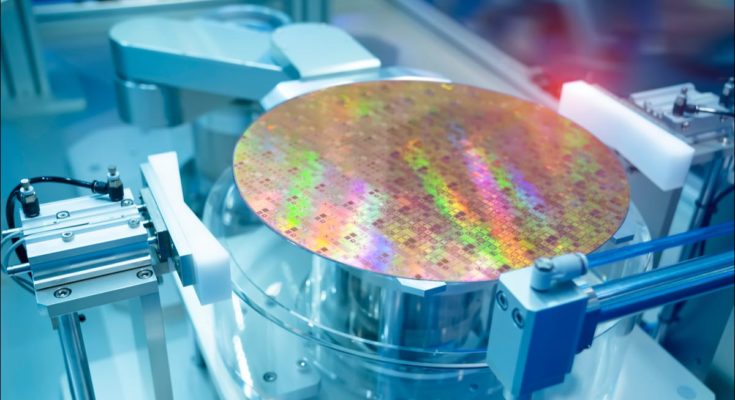 Microcircuitos sendo fabricados a partir de uma pastilha de silício.