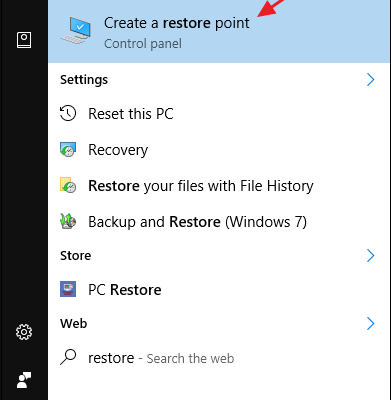 Clique no menu Iniciar, digite “restaurar” e clique em “Criar um ponto de restauração”.