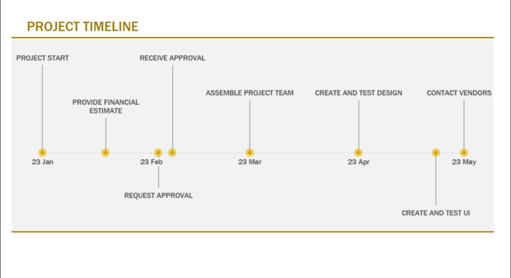Se você estiver procurando por uma linha do tempo do projeto com mais detalhes ou um toque especial, confira um dos modelos de linha do tempo da Microsoft. Um exemplo é este cronograma de projeto gratuito com marcos .