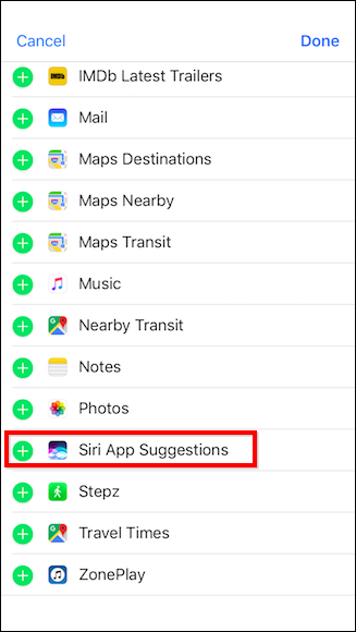 Para reativar as sugestões de aplicações, volte ao painel Adicionar Widgets e toque no sinal de mais verde ao lado de Sugestões de aplicações Siri.
