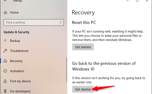 Em “Voltar para a versão anterior do Windows 10”, clique em “Primeiros passos”. Vá até a interface do assistente que parece reverter. O Windows solicitará que você reinicie o PC.