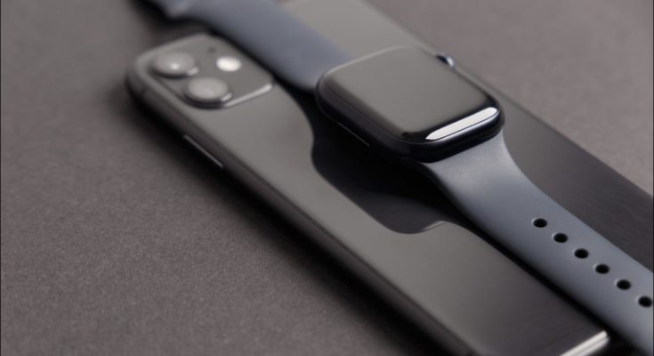 Um Apple Watch Series 7 preto em cima de um iPhone 11 correspondente.