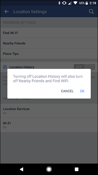 No meio da página, tu verá um botão de alternância que indica o Histórico de localização. Desative esta alternância. tu verá um prompt que permite saber a quais mini “aplicações” do Facebook tu perderá o acesso (e, consequentemente, quais não terão acesso à sua localização). Toque em OK para confirmar.
