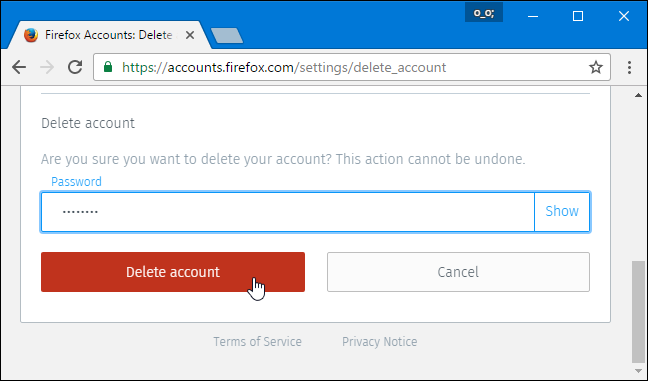 Digite a palavra-passe da sua conta do Firefox e clica no botão “Excluir conta”. Sua conta será apagada. Se tu deseja criar uma nova conta do Firefox Sync, tu pode.