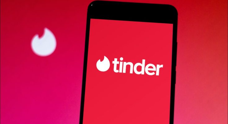 Smartphone mostrando o logotipo do aplicativo Tinder em um fundo vermelho.