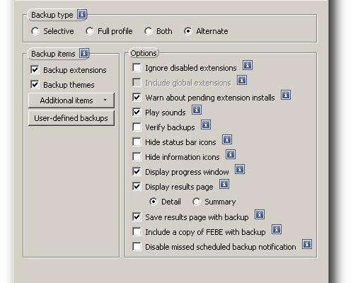 Para realizar esta tarefa, usaremos FEBE, um add-on do Firefox para fazer backup de suas configurações do Firefox. Tem várias opções de backup, desde um perfil completo a um backup seletivo que permite escolher entre extensões, favoritos, cookies, histórico, etc. Pode até fazer backup do Firefox periodicamente.