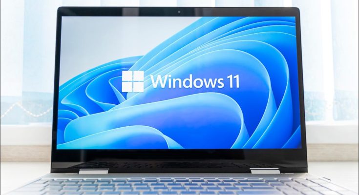 O logotipo do Windows 11 e o plano de fundo da área de trabalho em um laptop PC.
