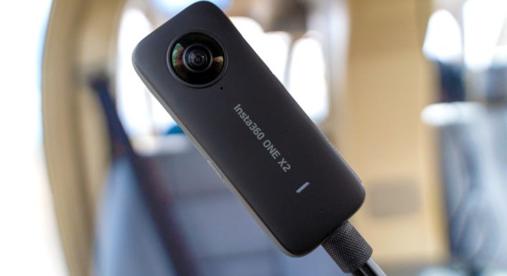 A câmera de ação ONE X2 de 360 ​​graus da Insta360 em um bastão de selfie preto.