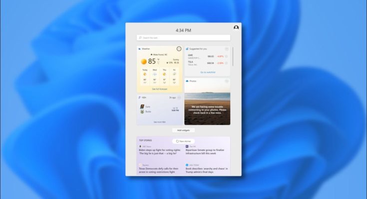 Depois de clicar no botão da barra de tarefas, o menu de widgets aparecerá. Você verá uma variedade de widgets em exibição por padrão – geralmente clima, ações, placares de esportes, fotos ou trânsito.