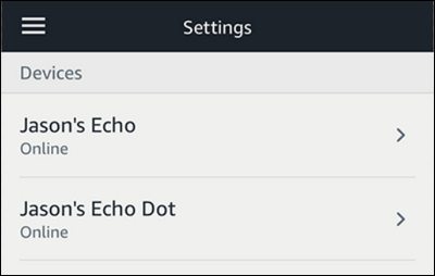 No menu Configurações, selecione qualquer um dos seus dispositivos Echo que sejam compatíveis, como o Echo e o Echo Dot vistos aqui.