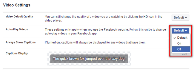 No menu “Configurações de vídeo”, selecione a caixa suspensa ao lado de “Reprodução automática de vídeos” e mude para “Desligado”.