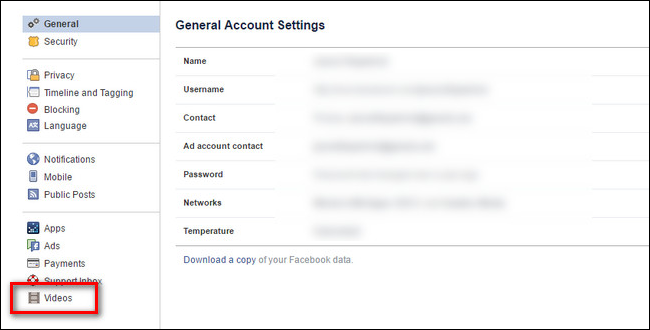No menu de configurações, selecione “Vídeos” na parte inferior do painel de navegação esquerdo.
