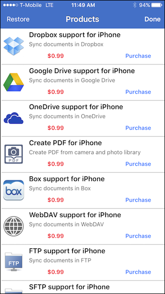 FoxIt offers additional in-app purchases, most notably the ability to add cloud drive support for some of the most popular services.