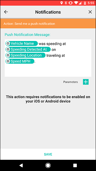 On the next screen, you can create your own custom push notification. Add information from Automatic by tapping the Parameters button. You can also add text to make the notification read more naturally. When you’re finished, tap Save.