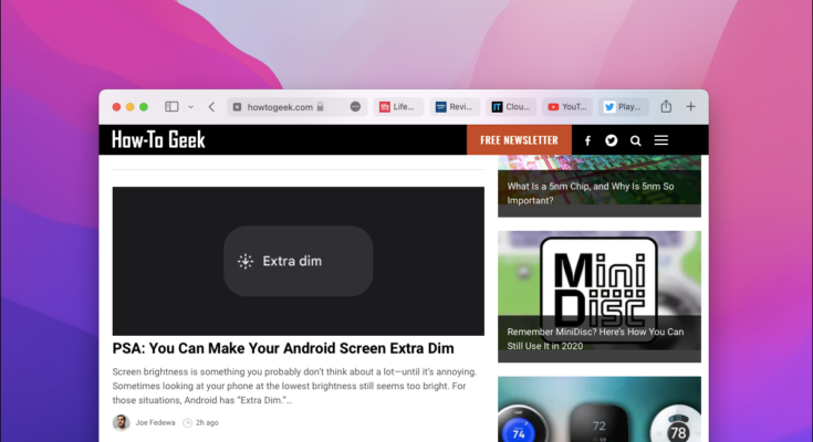 Ao contrário do Google Chrome e do Microsoft Edge, as guias do Safari aparecem por padrão na barra de endereço, chamado de layout “Separado”. Mudar para o layout de guias “Compacto” alinha a barra de endereço com as guias para permitir mais área para sites. Além disso, você verá apenas o favicon junto com o domínio do site, não o URL completo da página . Assim, por exemplo, não importa onde você esteja em nosso site, você só verá howtogeek.comna barra de endereço.