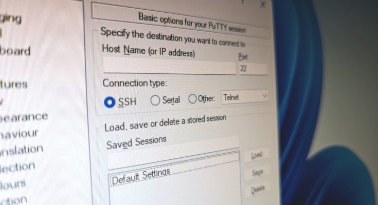 Close de uma tela de computador com opções de configuração do PuTTY visíveis.