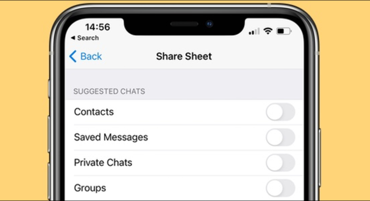 Você pode escolher manter um determinado tipo de bate-papo na página de compartilhamento do iPhone na mesma página de configurações. Por exemplo, costumamos enviar links para o bate-papo de mensagens salvas no Telegram. Esse é o único tipo de bate-papo que permitimos como sugestão de planilha de compartilhamento.