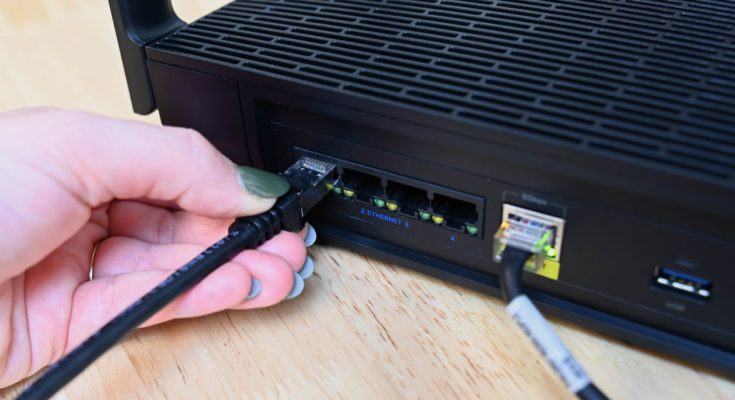 Pessoa conectando o cabo Ethernet Cable Matters em um roteador