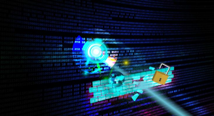 Ilustração digital de um feixe de luz perfurando um teclado de computador e atingindo uma parede de números e zeros.