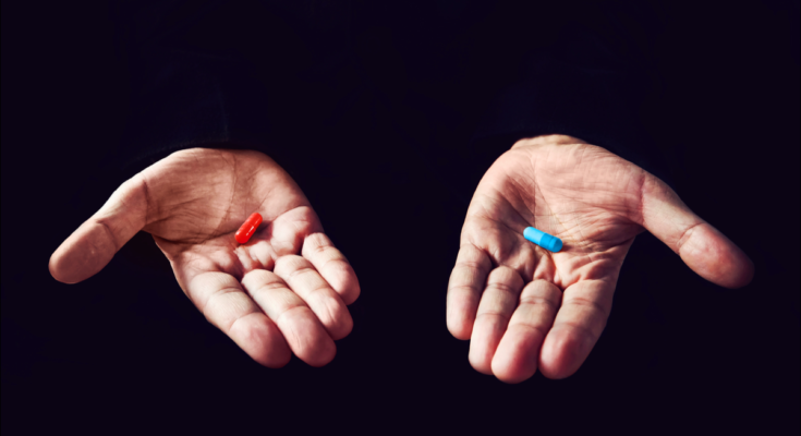 Duas mãos, uma segurando uma pílula vermelha e a outra uma pílula azul.