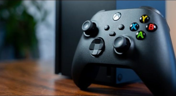 Um controlador de Xbox com um Xbox Series X em segundo plano