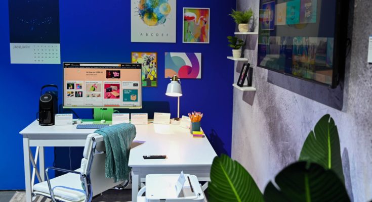 Mesa Amazon montada na CES 2023 com obras de arte na parede.